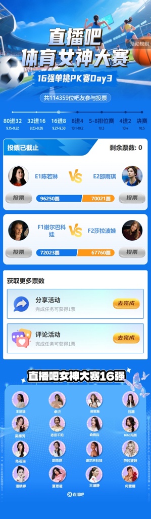 2025年『体育女神大赛』昨日结束了16强单挑PK赛Day3的争夺,Day3具体结果如下: