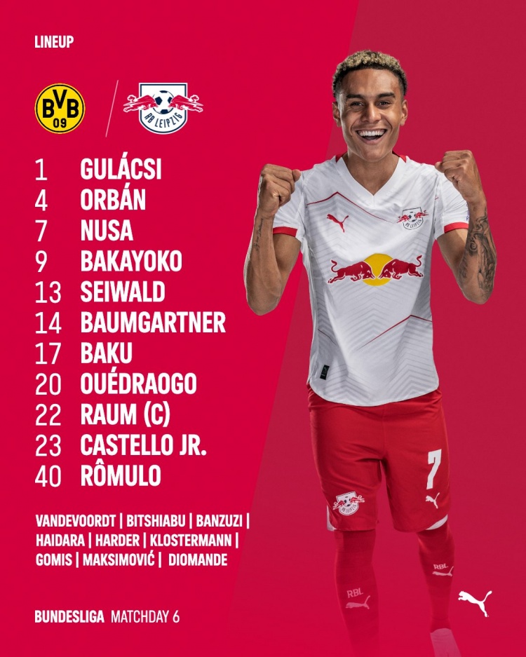 多特vs莱比锡首发:吉拉西、阿德耶米、劳姆、努萨在列